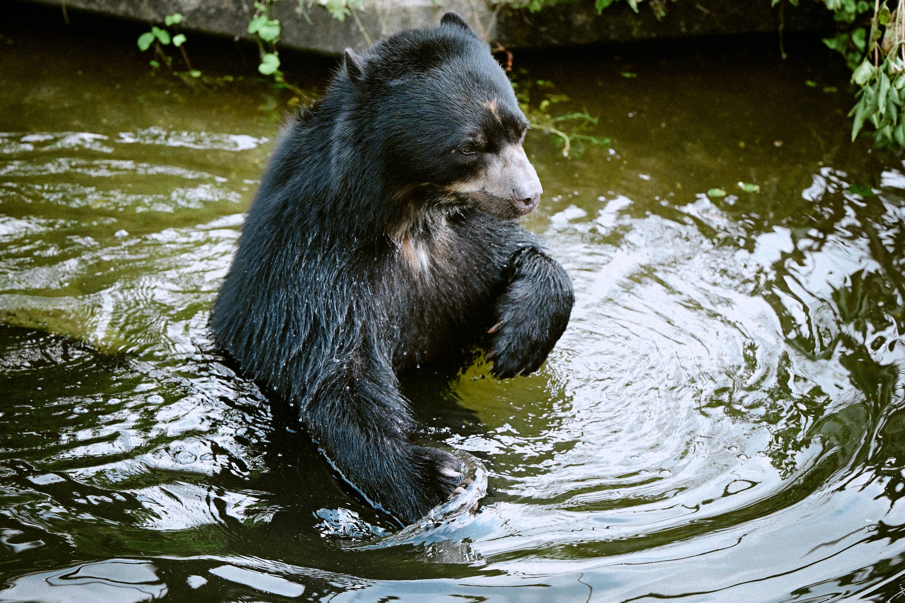 Brillenbär „Hans“ lebt neu im Kölner Zoo. Er kam am 14. August aus dem Tierpark Berlin an den Rhein. „Hans“ ist sechseinhalb Jahre alt und ein ausgesprochen aktives Männchen. Er liebt es, im Wassergraben seiner Anlage zu baden oder auf seinen Kletterbaum zu klettern.