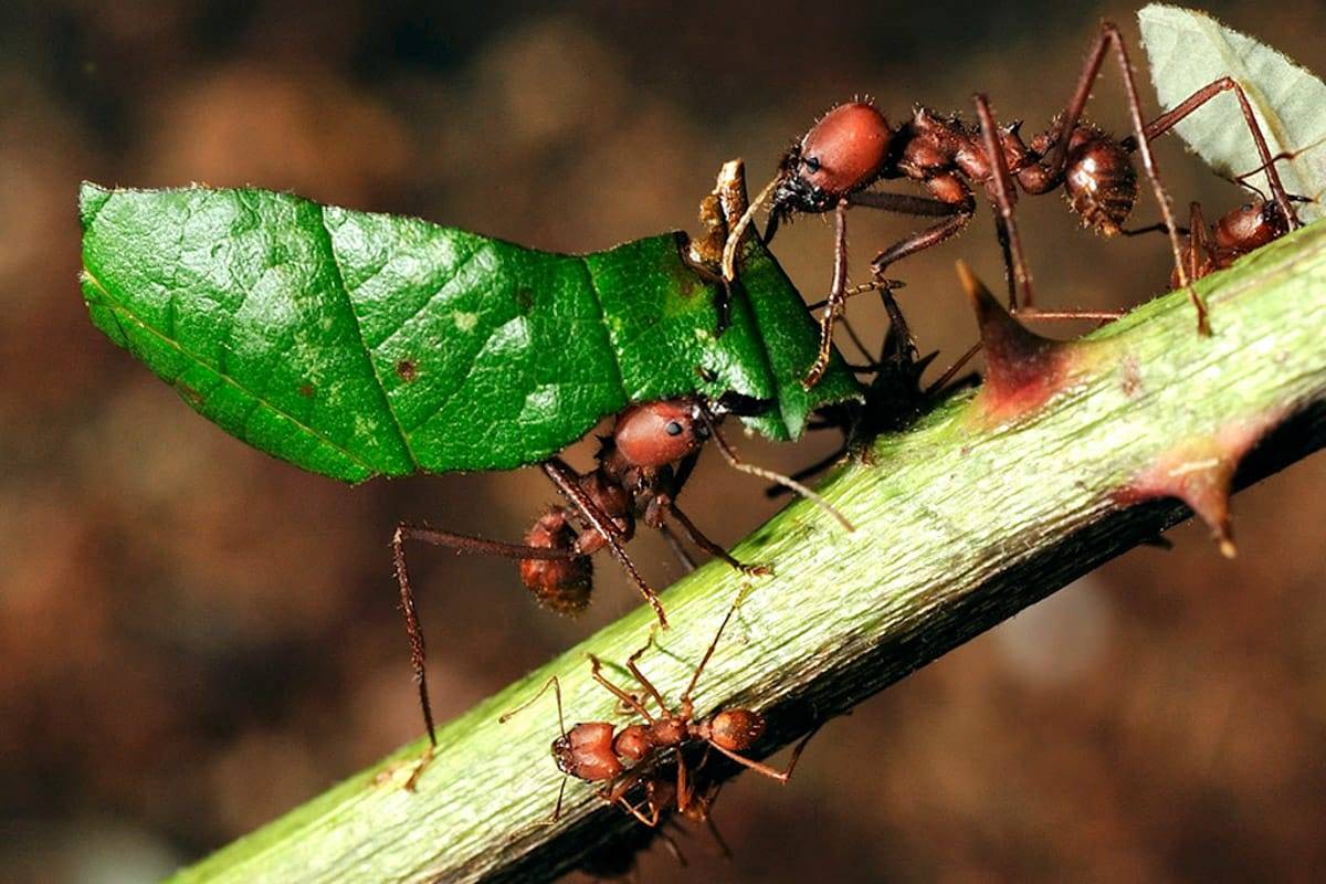 Blattschneiderameisen betreiben perfekte Arbeitsteilung. Die "Schneider" haben besonders starke Kiefer, die "Transporteure" sind an das schnelle und ausdauernde Laufen angepasst. "Kundschafter", die eine Nahrungspflanze aufgespürt haben, markieren den Weg mit Duftstoffen.