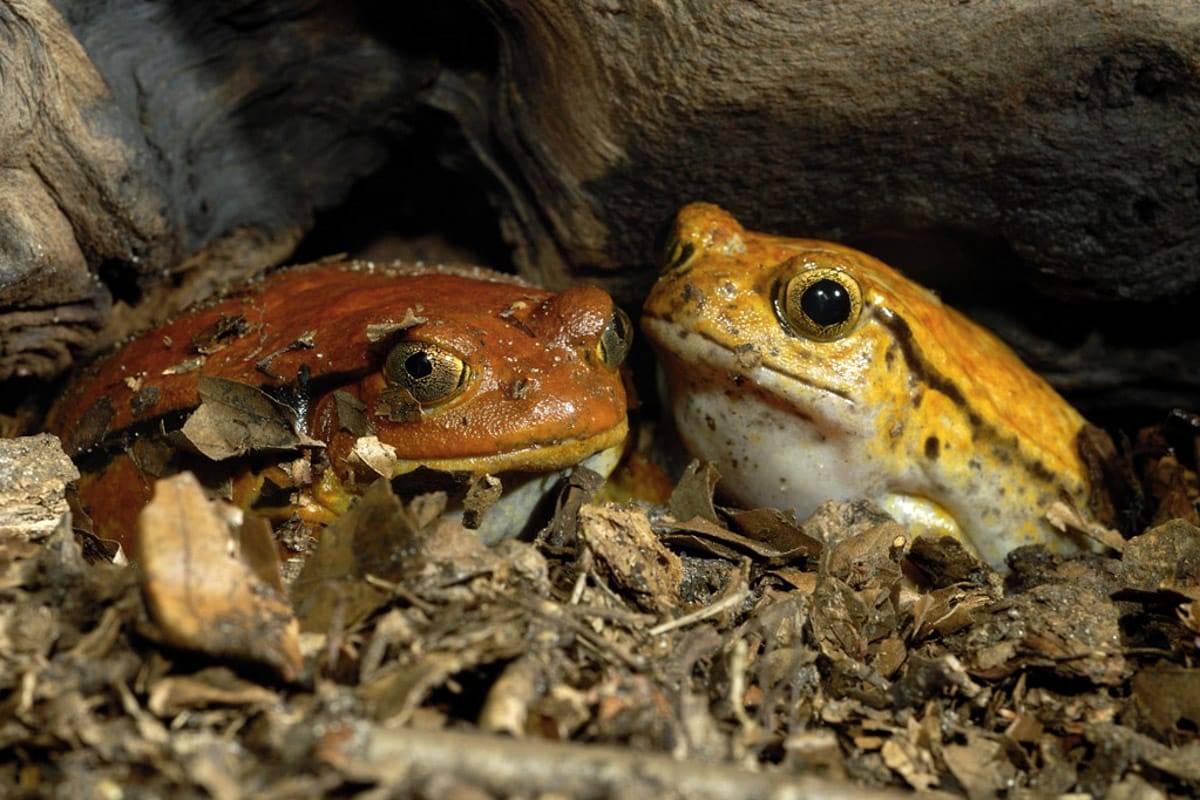 Der Tomatenfrosch ist sehr auffällig gefärbt, rot, orange, rotbraun und alles sehr intensiv. Manche haben auch dunklere Flecken auf der Haut im Halsbereich über dem gelb-weißen Bauch. Wegen seiner glatten Haut auf dem Rücken ähnelt er einer Tomate. Der Nachtaktive Tomatenfrosch währt sich bei Gefahr in dem er sich aufbläst und sein Hautdrüsensekret mehrere Zentimeter weit spritzt. Sein Hautdrüsensekret kann bei Menschen zu Hautschwellungen führen.